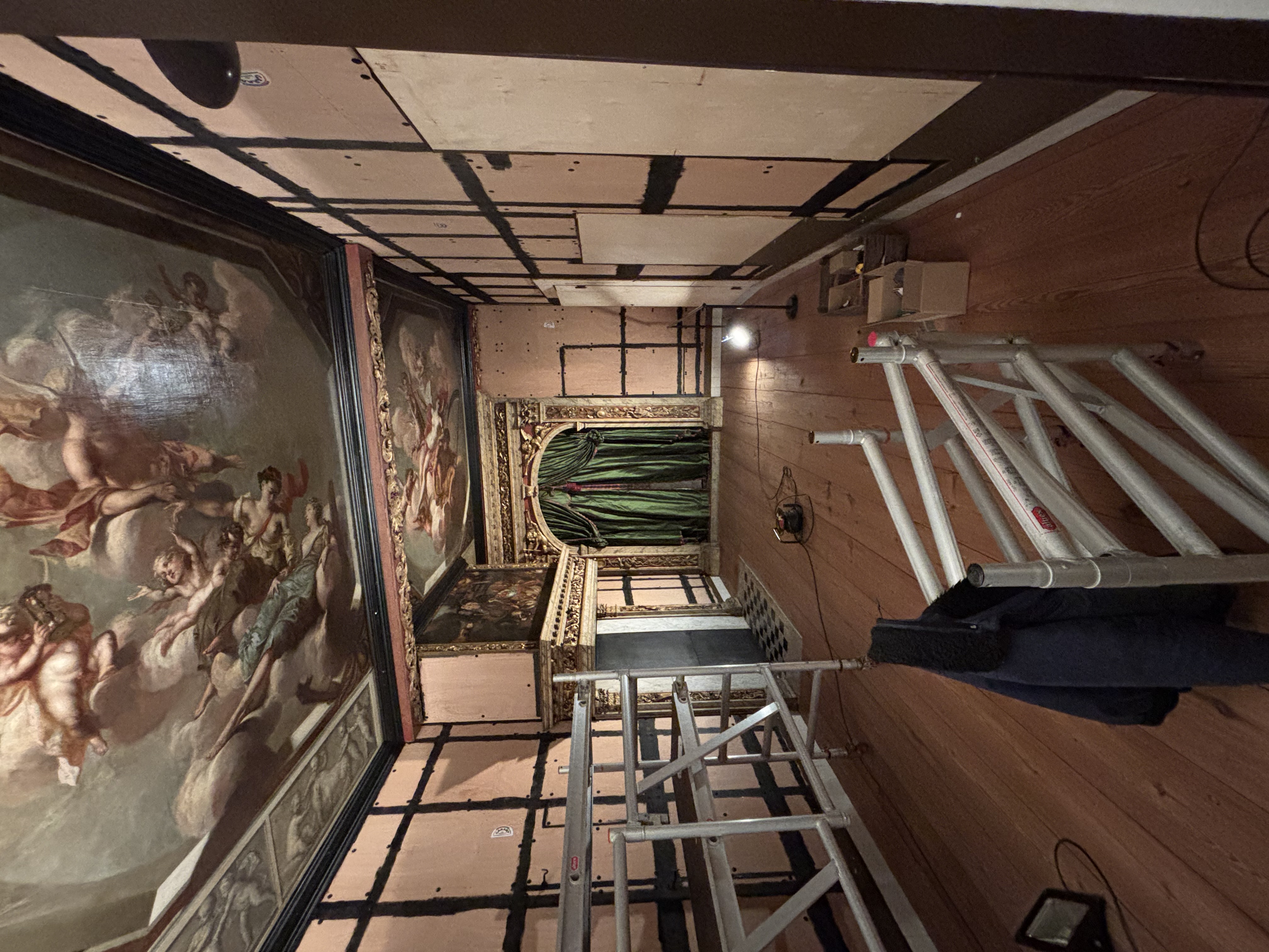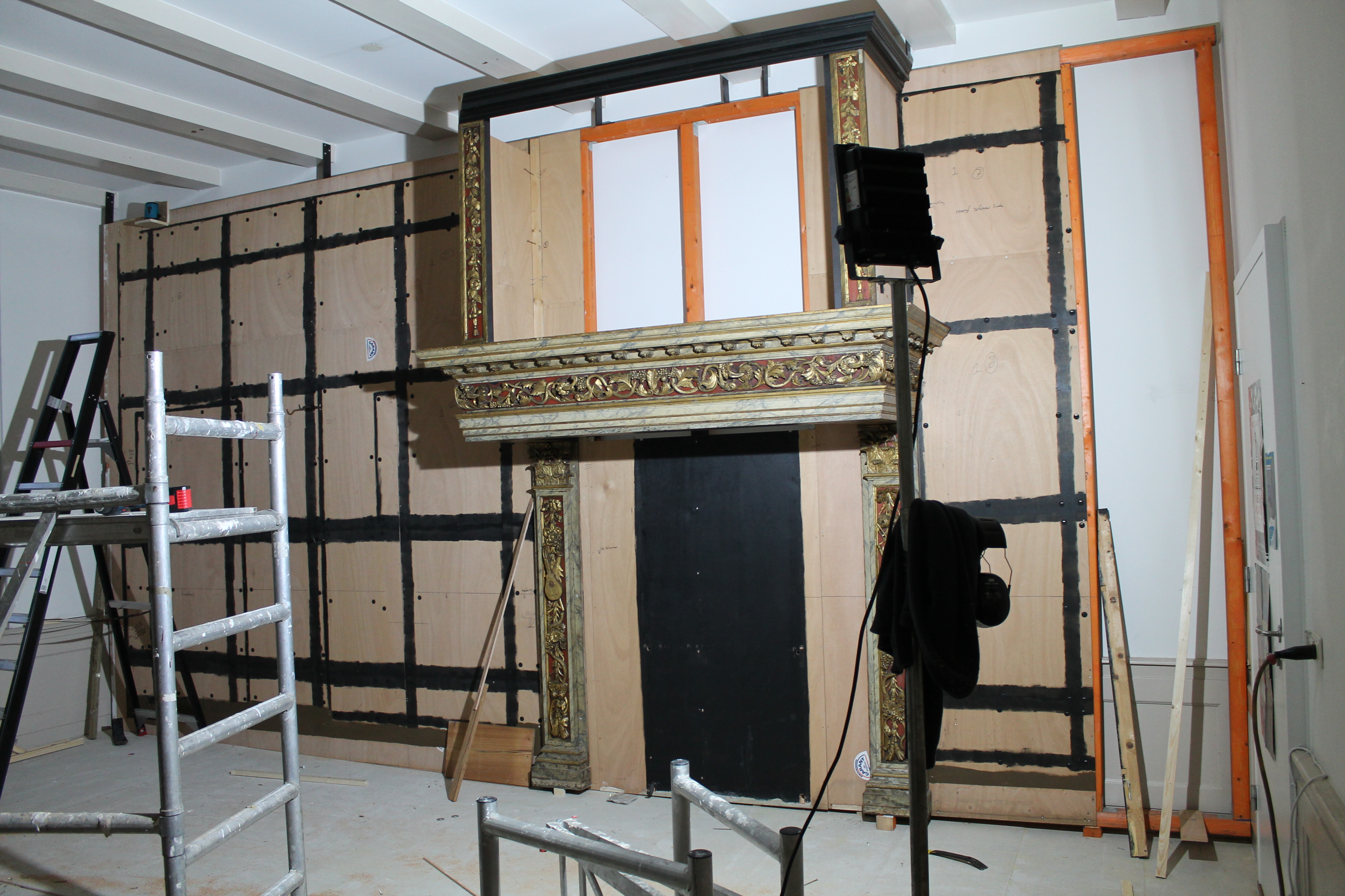 De opdracht voor Lares, in samenwerking met Matteo Visser en Jeroen van Koolwijk, bestond uit het verplaatsen en aanpassen van de goudleerkamer. Dit betreft de structuur van de muren, plafond en vloer. Daarin opgenomen monumentale onderdelen als de schouw, de alkoof en de plafondschilderingen. De ramen met kruiskozijnen waren in de vorige situatie niet aanwezig en zijn nieuw door ons bijgemaakt. De muur met deze ramen staat op een verrijdbare constructie, zodat de buitengevel nog bereikbaar is. Ook hebben wij de hoogte van de kamer aangepast, zodat het goudleer beter passend geplaatst kon worden. Daarnaast moest de hoogte aangepast worden om de kamer in zijn geheel in de nieuwe ruimte te kunnen plaatsen. Het goudleer is gerestaureerd en aangevuld door Herre de Vries.